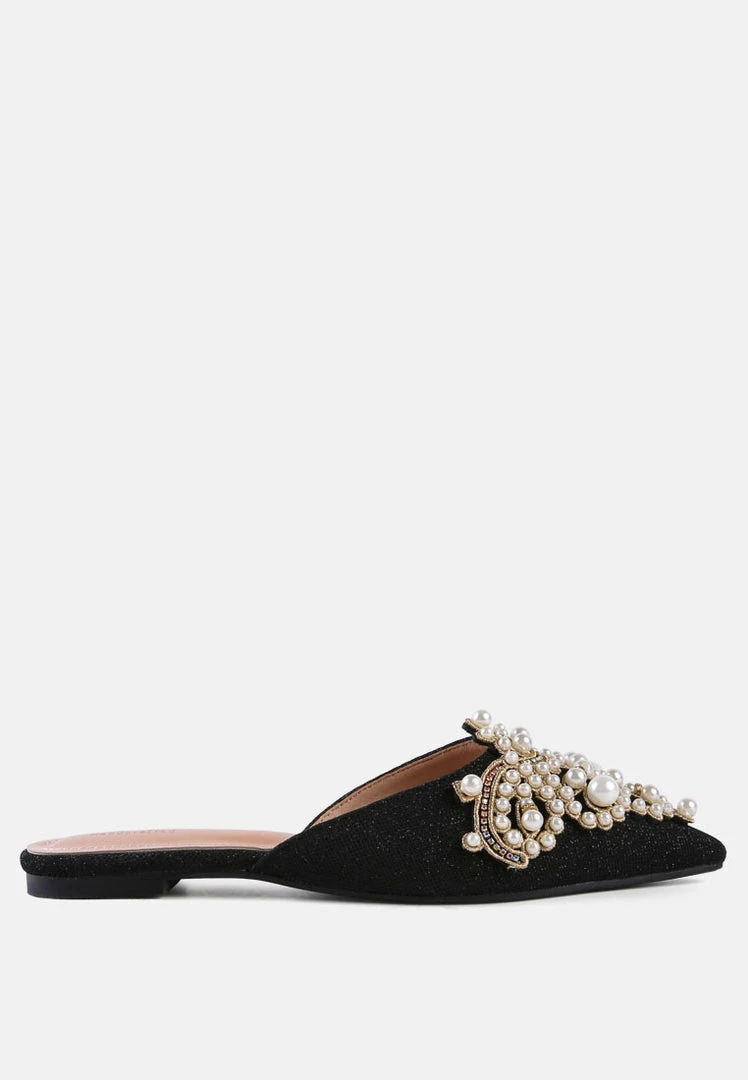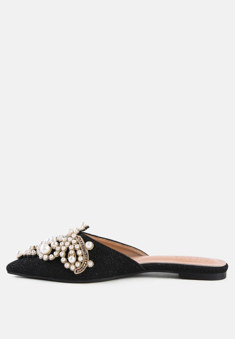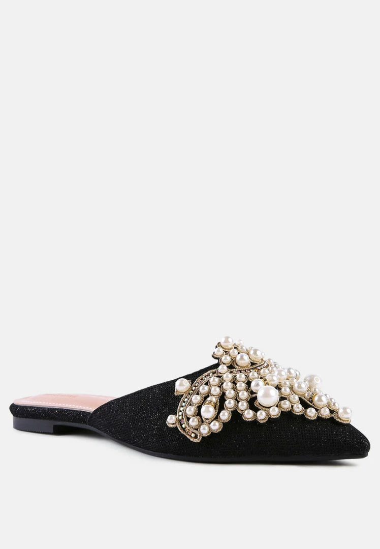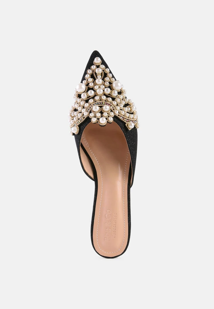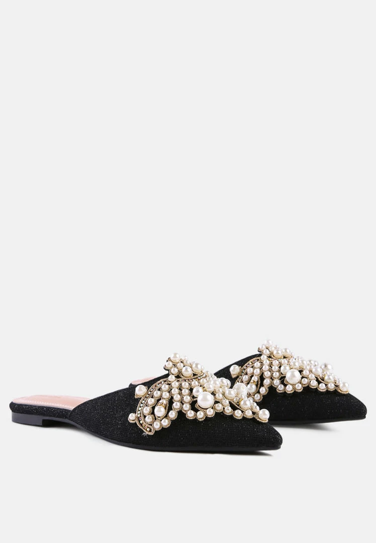 Luxury Handcrafted pair of casual Mules with high quality man made pearls and metallic wires. The trellis of pearl design sits atop the pointed flats in an ornamentated fashion which speaks of dedication and delicate craftsmanship. Has cushioned insole which helps absorb shock. Keeps safe with anti slip rubber outsole.