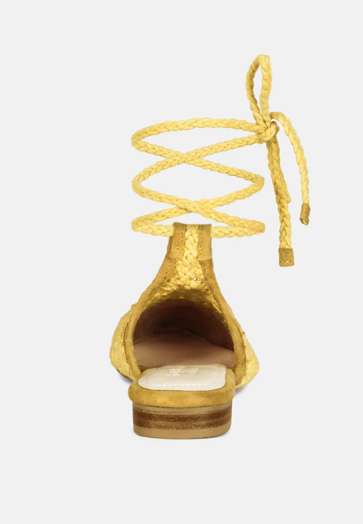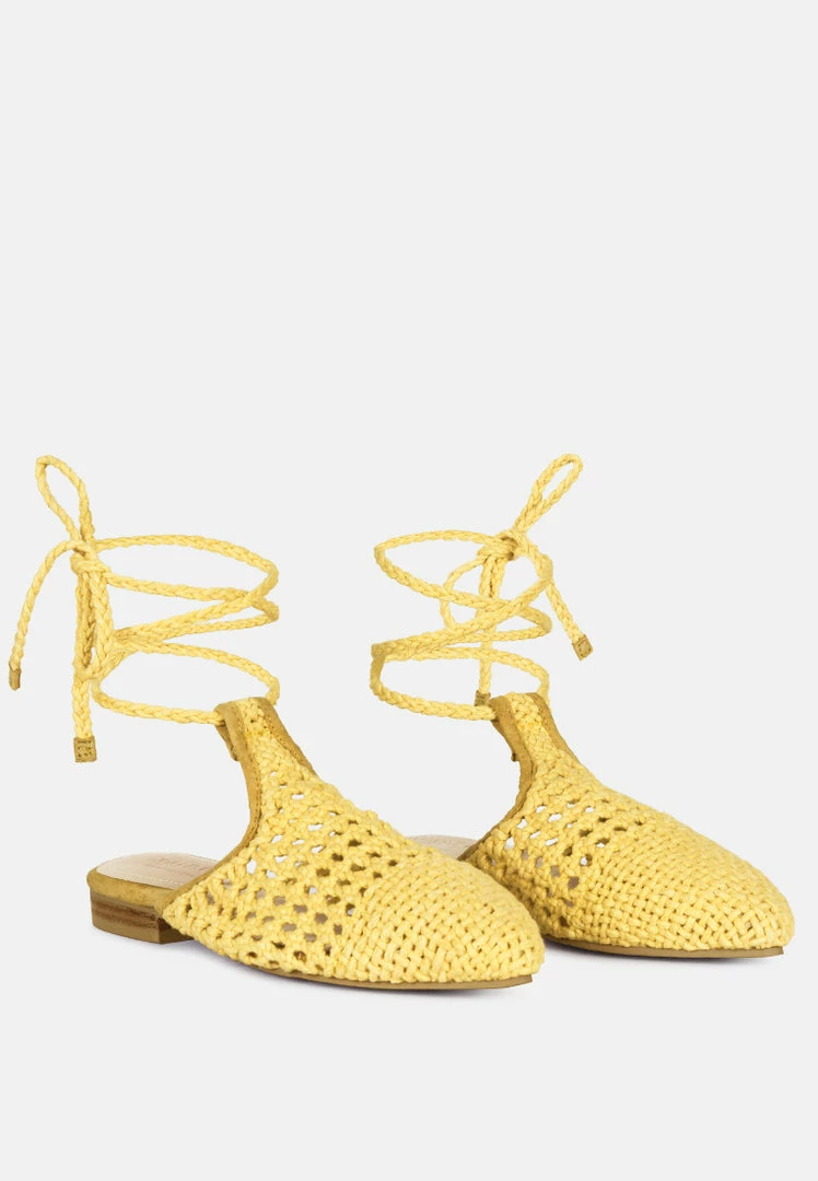 Handwoven and knitted cotton mules with foam cushioned insole is all natural, comfortable and treasured handcrafted piece. The tie up flat mule cum sandal will be your favorite go to shoe this spring and summer.