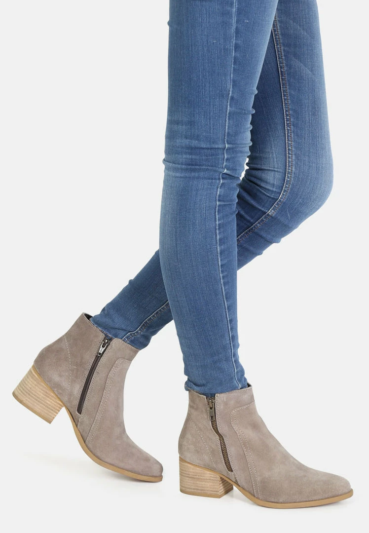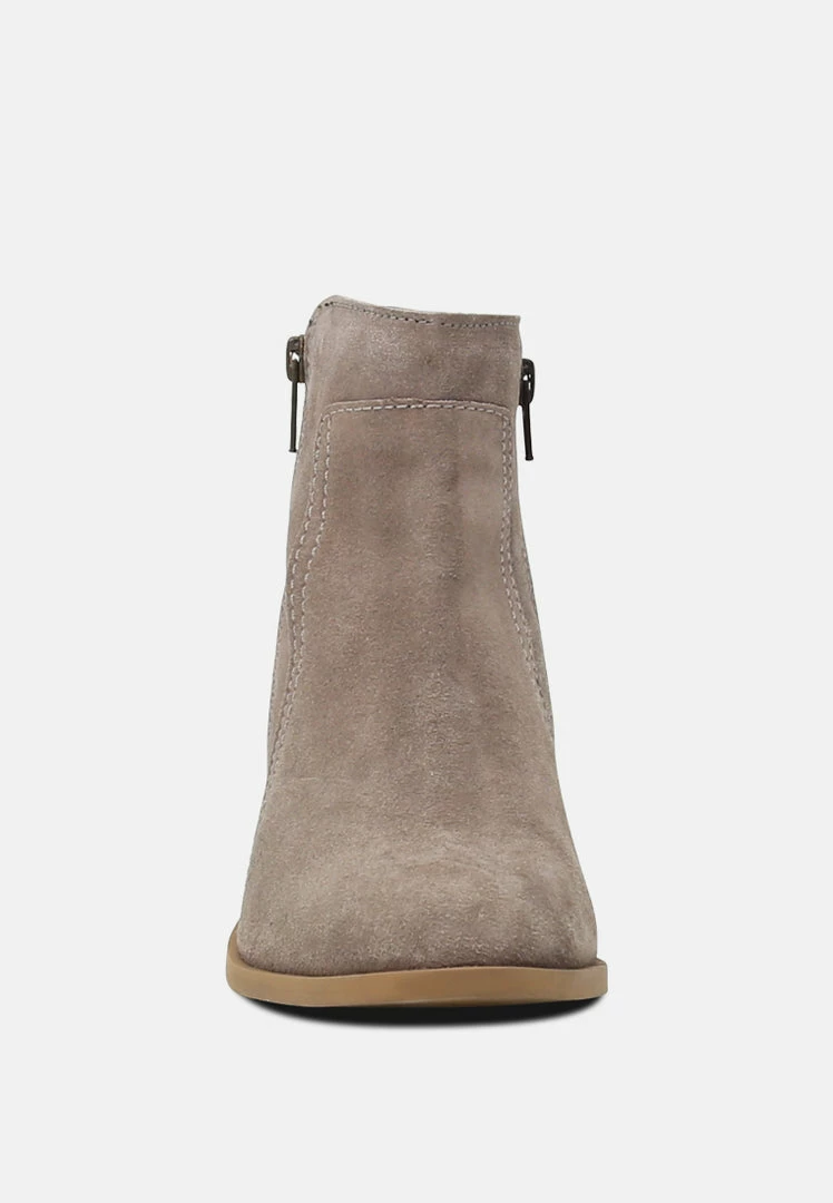 Ankle boot in taupe to give that groovy vibe to your outfit. Added stack heel to uplift your confidence everyday. Made with fine suede and quality assurance. A perfect pair for a date or for outings all seasons.