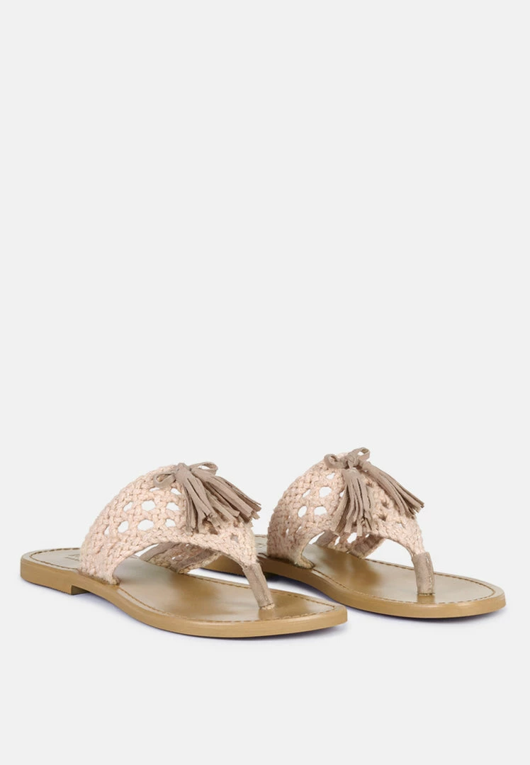 Rag & Co BEECH Handwoven Natural Latte Suede Tassel Thong Flats