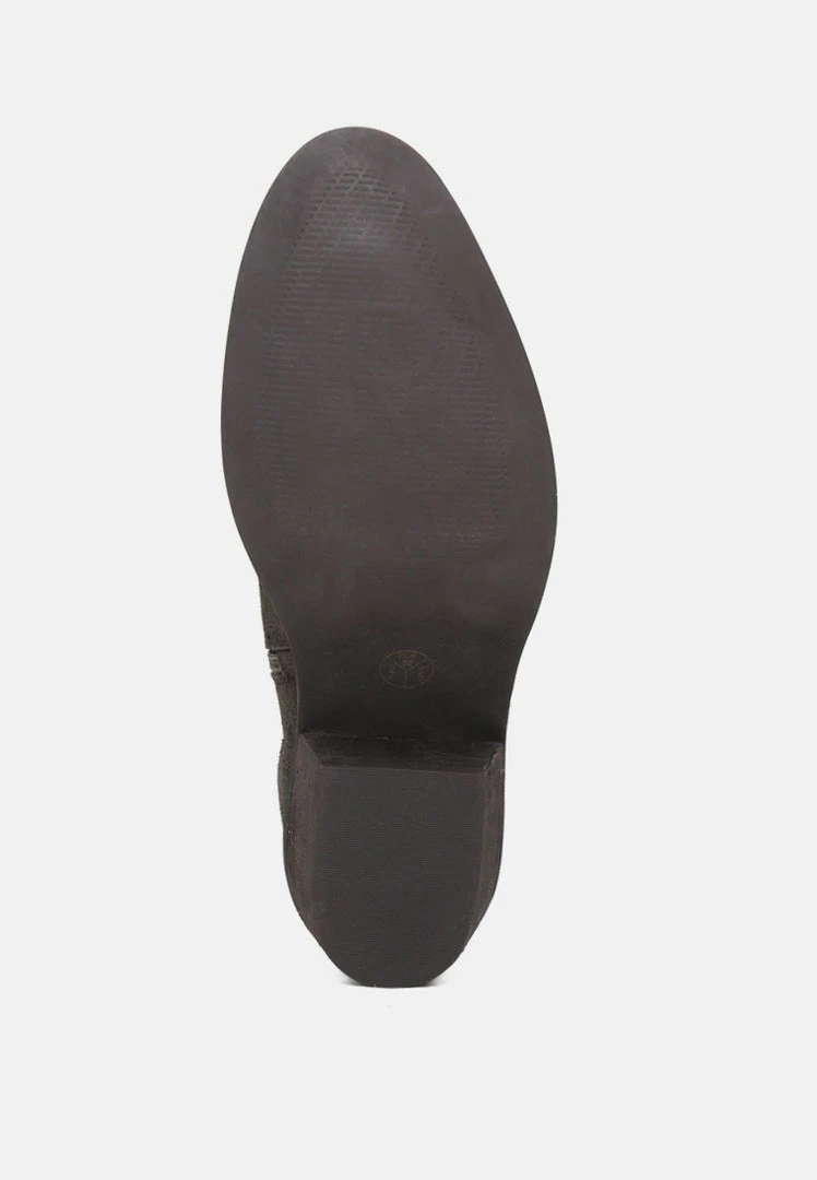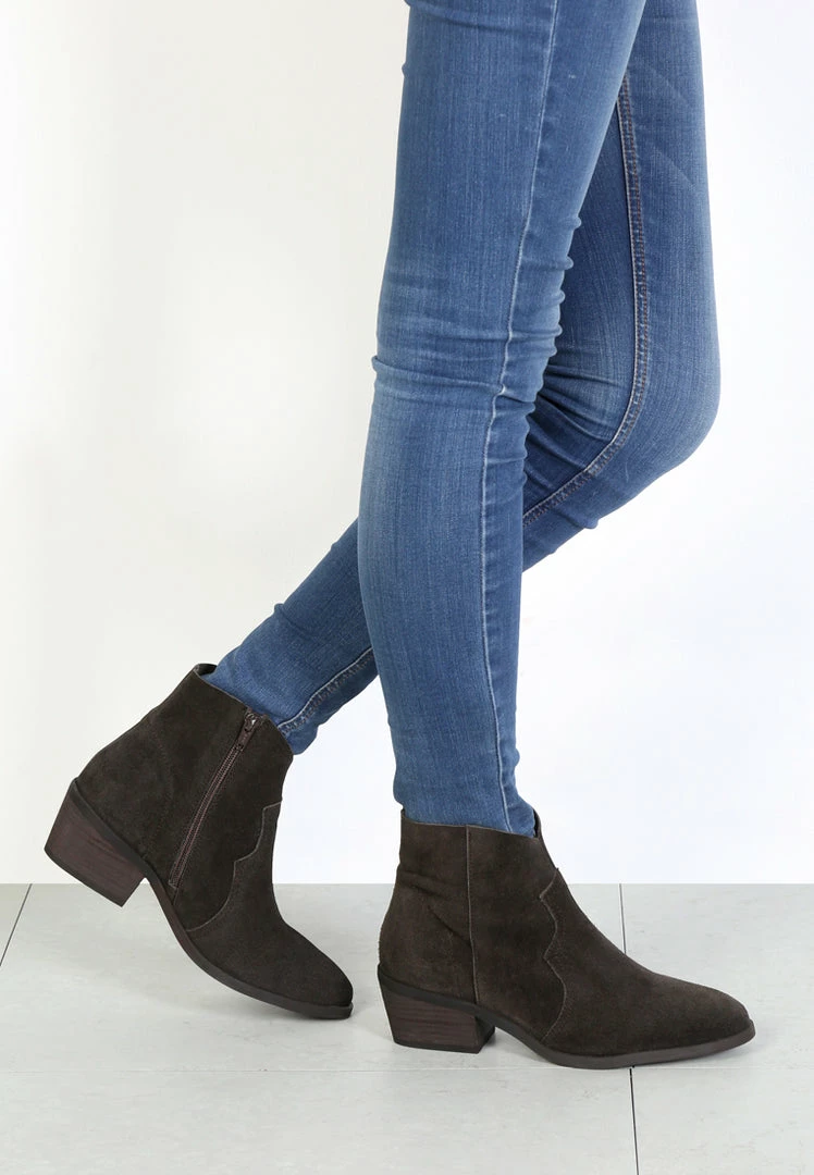 The Brisa bootie from Rag & Co flaunts sleek western styling while still staying versatile. A soft suede construction is finished with an asymmetrical topline and chunky block heel for your new favorite ankle boot.