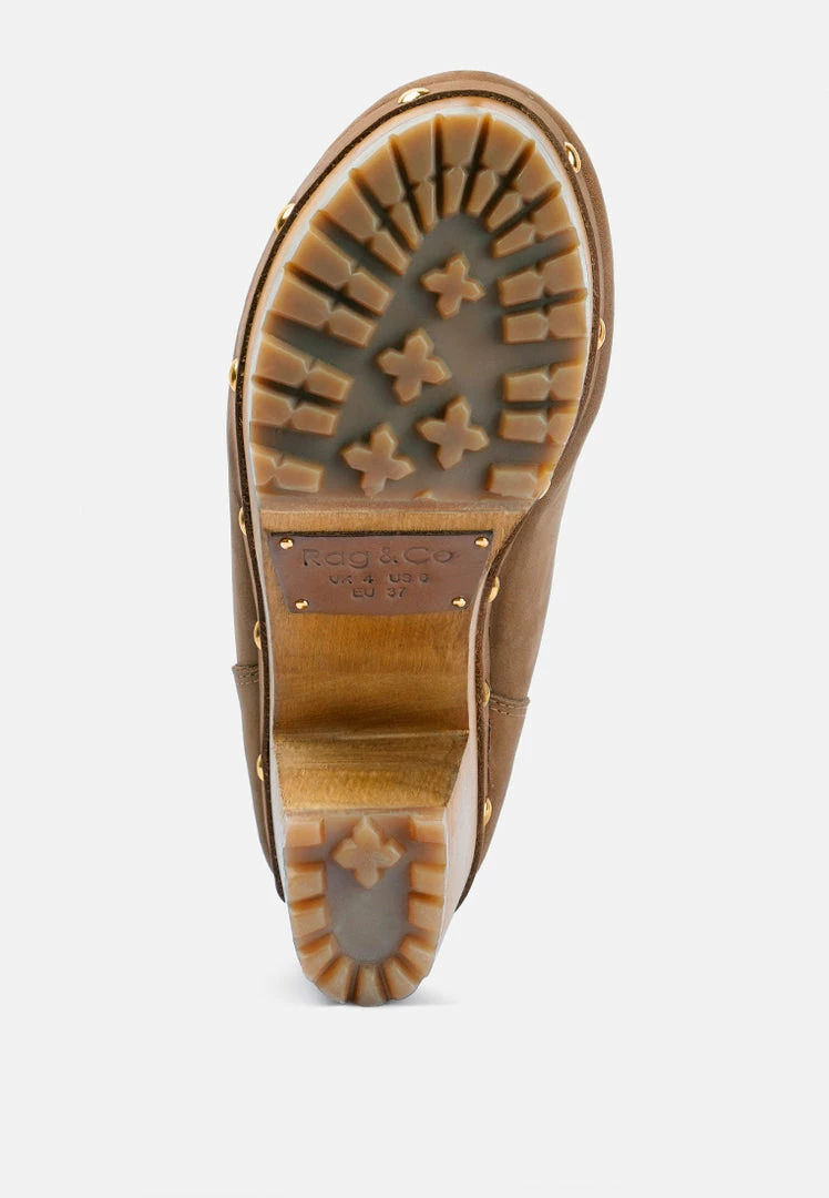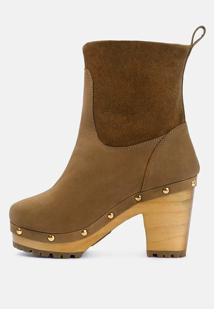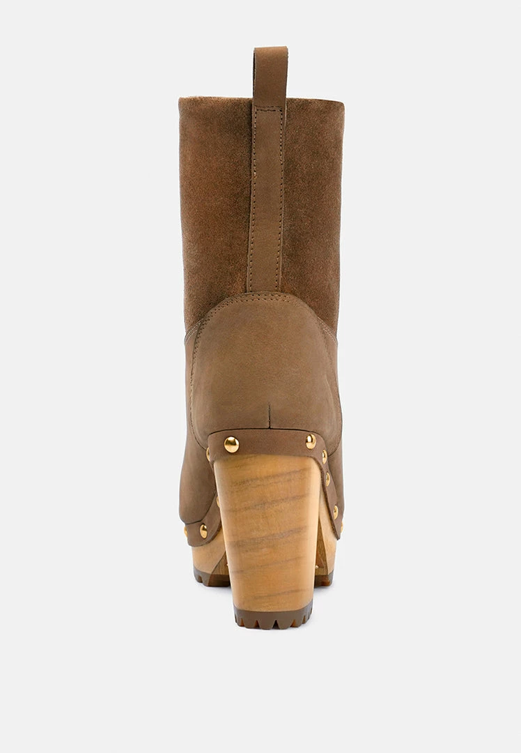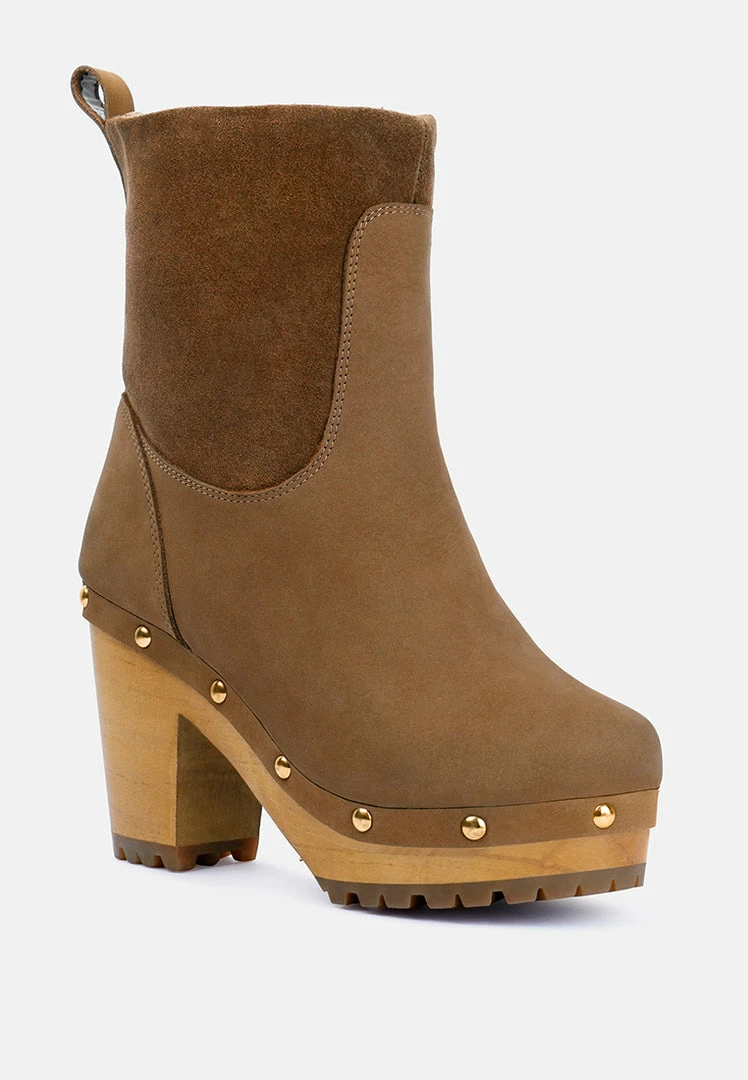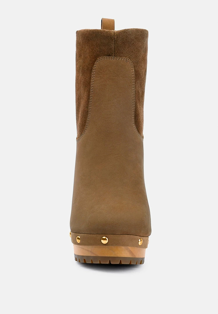 Handcrafted Block Heeled Chelsea Boot in soft tanned genuine suede leather is for keeps! It has hand chiseled block heel which fits along the feet curve well. The shoe has metallic stud detail and comfortable round toe!