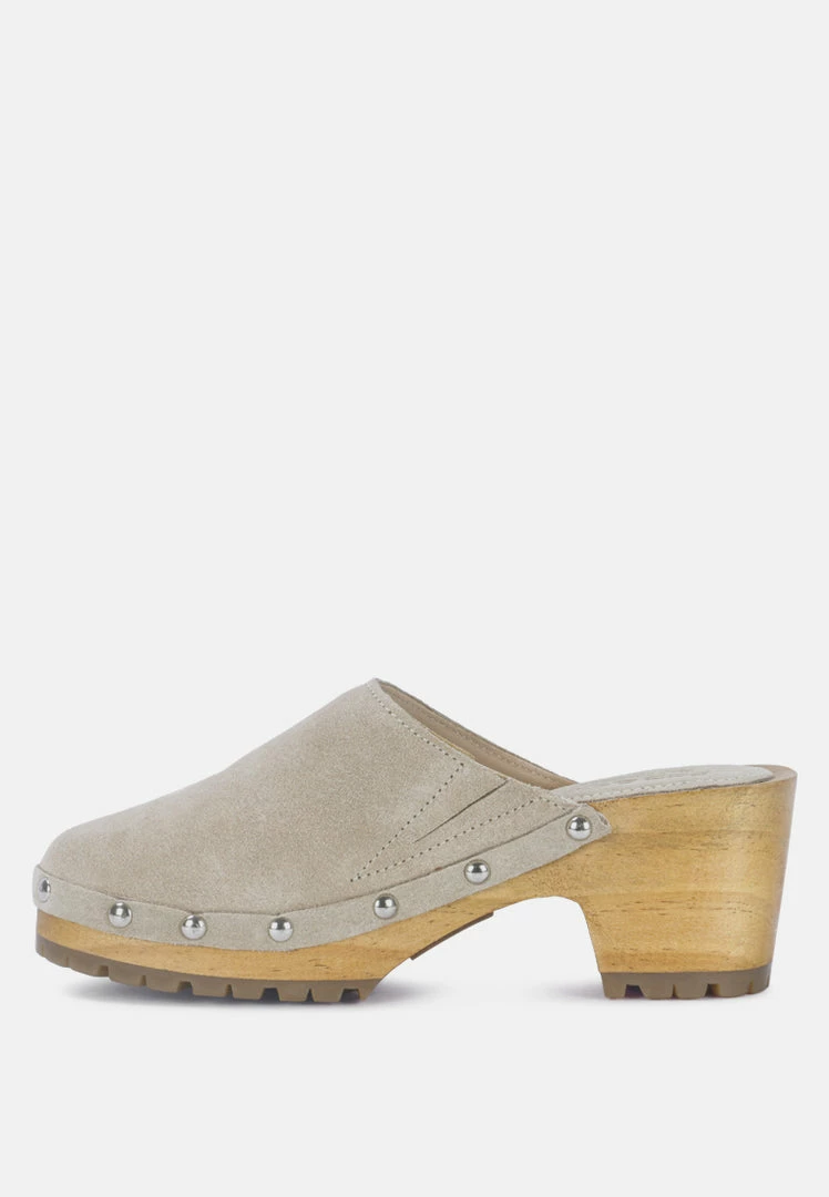 Round Toe Suede Clogs with Stud Details in handcrafted wooden heels has been handcrafted with precision and painstaking detail to fit each foot perfectly. The wooden block heel has stud details along the line and an anti-slip durable outsole which keeps you protected on all surfaces. Superbly stylish, available in limited quantities with ethically sourced fine leather suede.