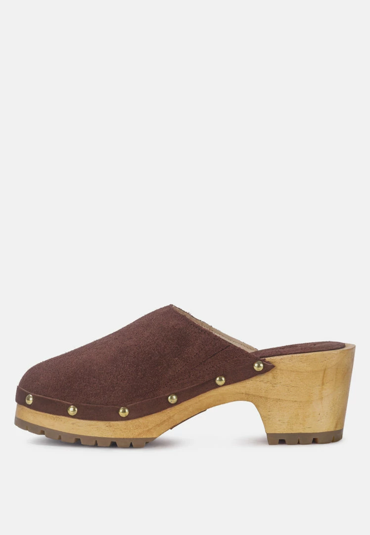 Round Toe Suede Clogs with Stud Details in handcrafted wooden heels has been handcrafted with precision and painstaking detail to fit each foot perfectly. The wooden block heel has stud details along the line and an anti-slip durable outsole which keeps you protected on all surfaces. Superbly stylish, available in limited quantities with ethically sourced fine leather suede.