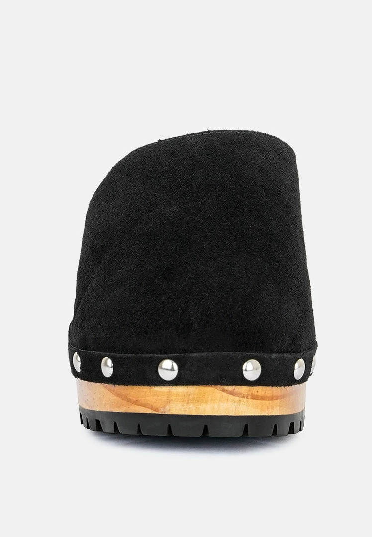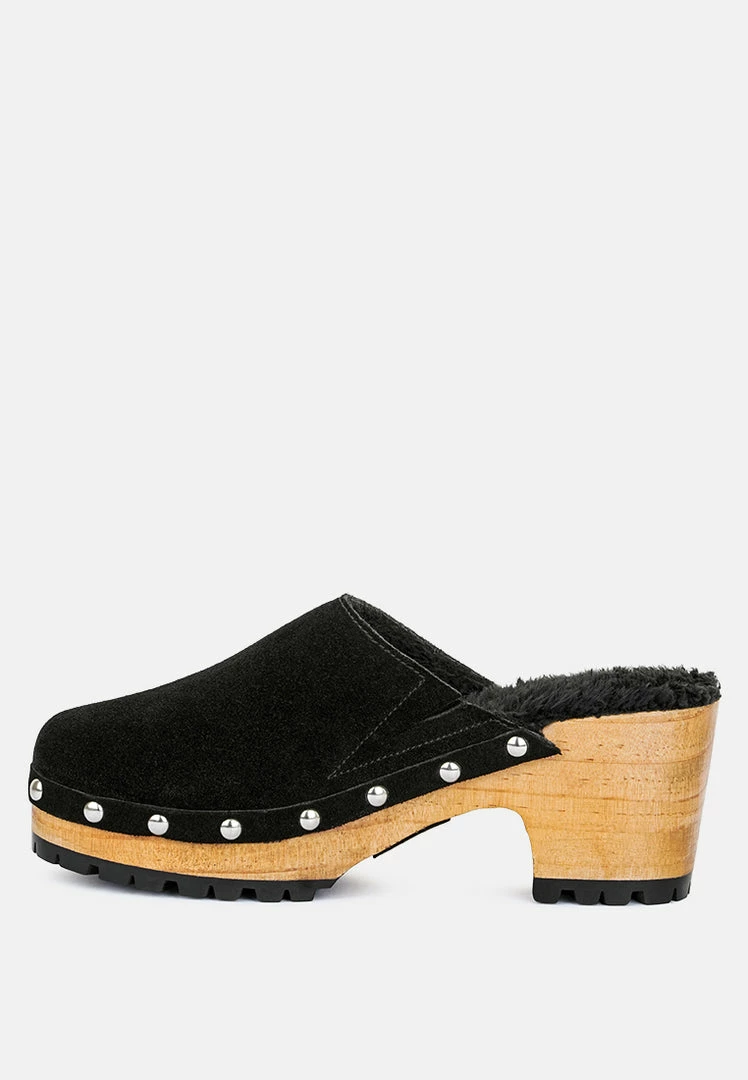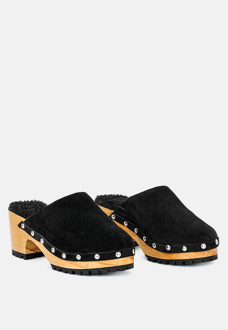 Handcrafted Soft Leather Suede Clogs – the closed round toe premium leather slides with fur lining keeps sole warm and cozy; has been handcrafted with precision and painstaking detail to fit each foot perfectly. The wooden block heel has stud details along the line and an anti-slip durable outsole which keeps you protected on all surfaces. Superbly stylish, available in limited quantities with ethically sourced fine leather suede.