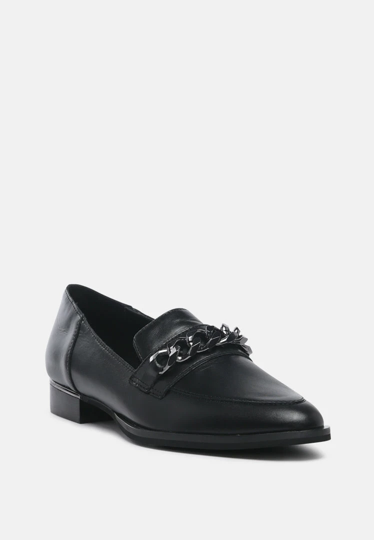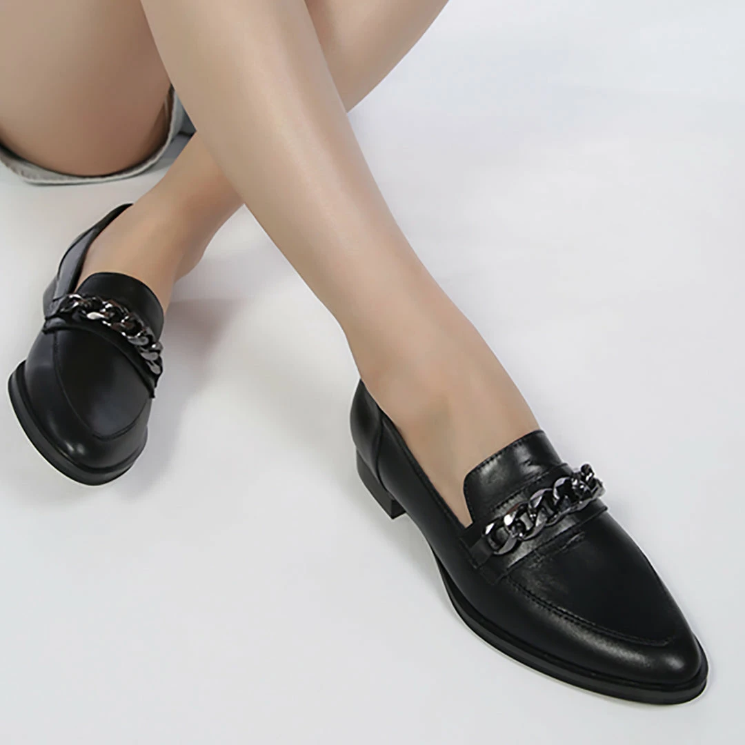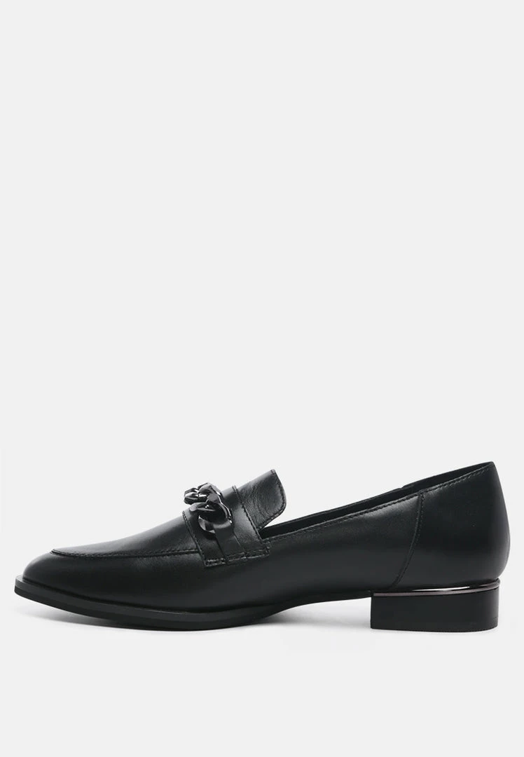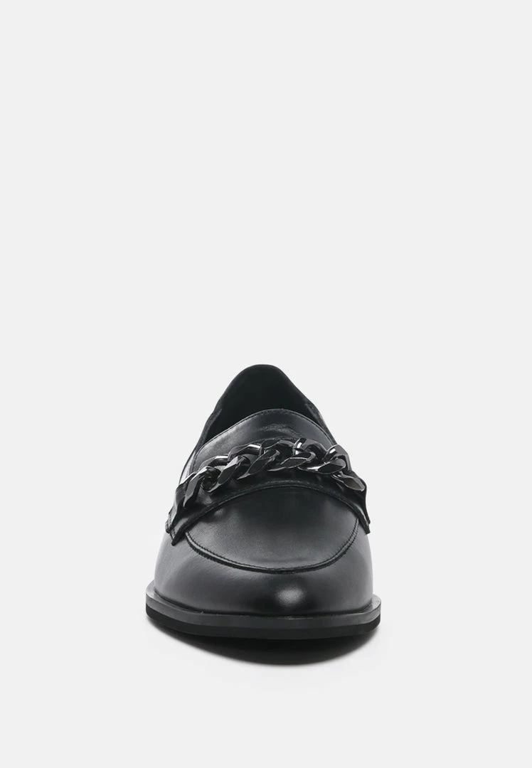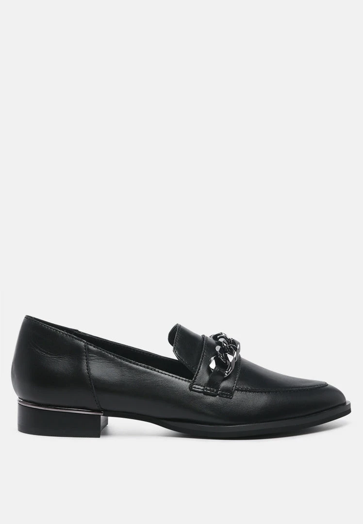 Black Semi Casual Leather Slip-on Loafers with Metallic Chain Detail: looks good and feels good with style and comfort guaranteed. Shine from top to bottom and be prepared for the day ahead with this. You are ready to hit the high street with these in your closet.