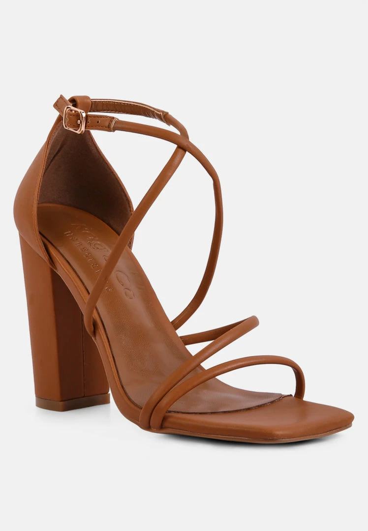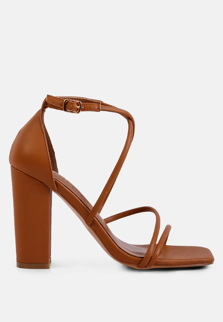 Stylish and staple for the day and after hours! Finely crafted high block heeled sandal with delicate thin straps which run across the feet. The sandal has pin buckle fastening which secures feet. Light cushioning in the insole cuts strain.