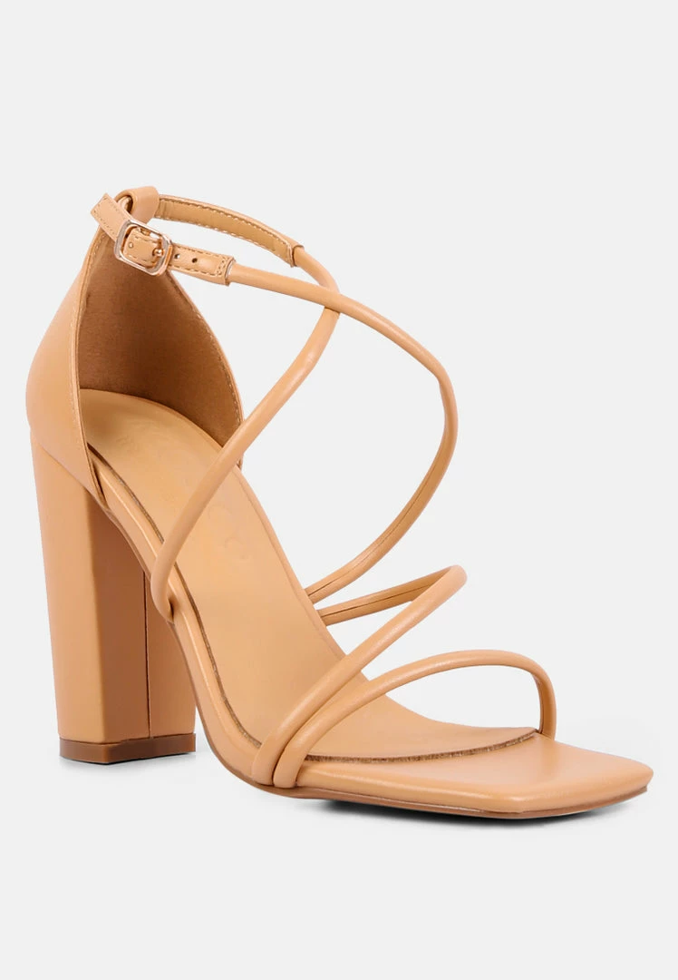 Stylish and staple for the day and after hours! Finely crafted high block heeled sandal with delicate thin straps which run across the feet. The sandal has pin buckle fastening which secures feet. Light cushioning in the insole cuts strain.