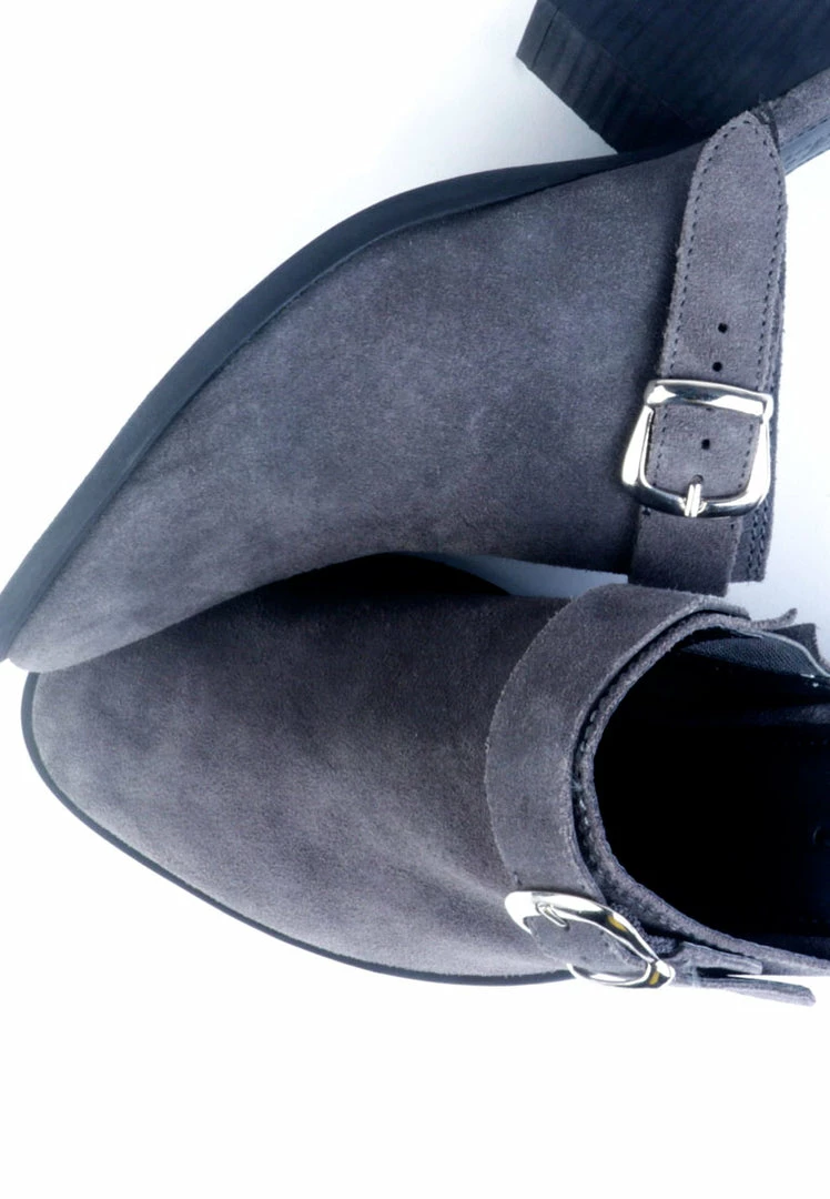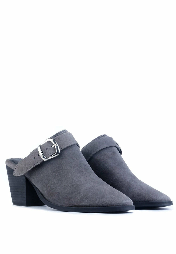 Flaunting a pointed toe and buckled strap, this pair is perfect for summer. Styled with a Stacked heel, these mules are a great combo of style and comfort.