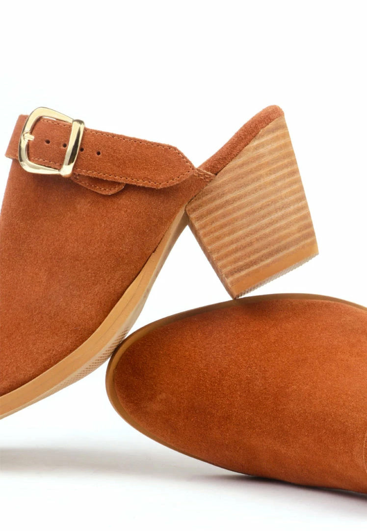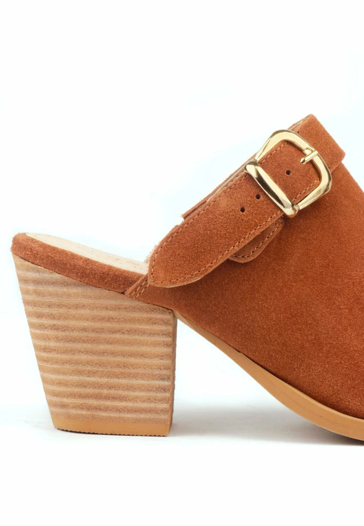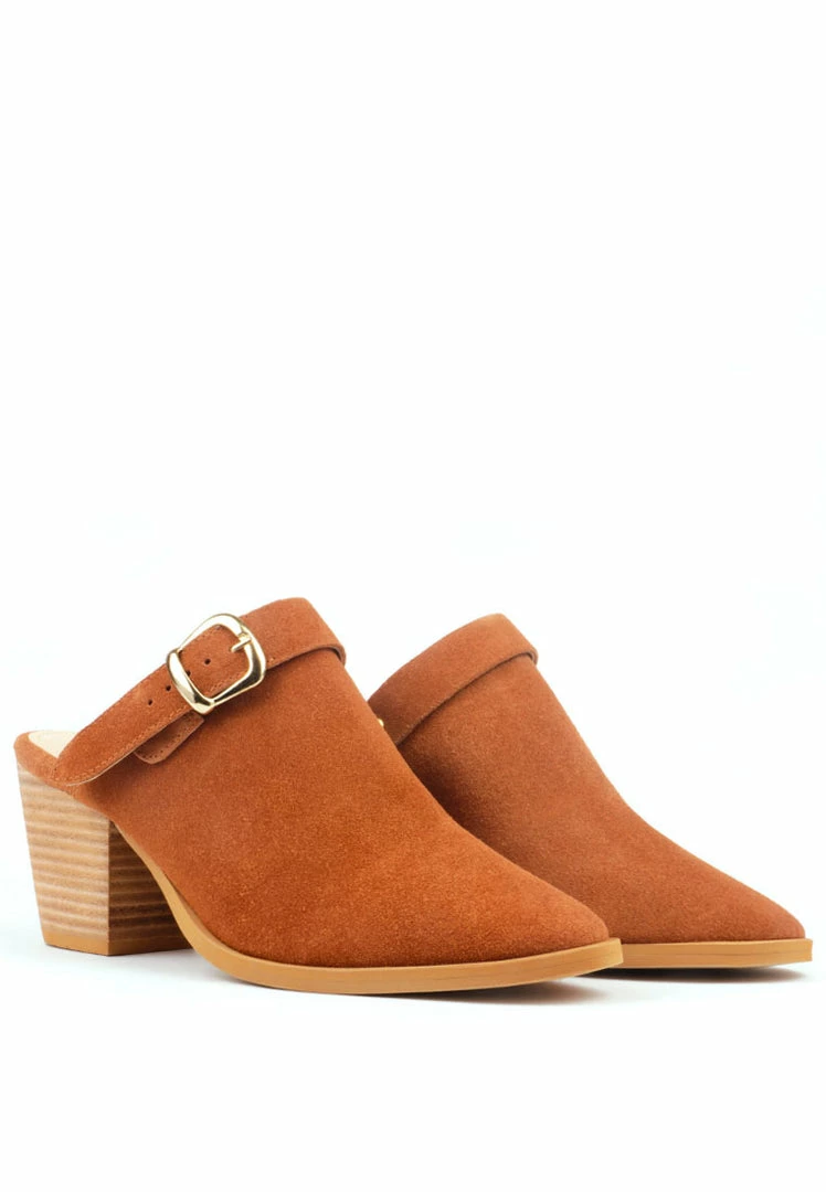 Flaunting a pointed toe and buckled strap, this pair is perfect for summer. Styled with a Stacked heel, these mules are a great combo of style and comfort.