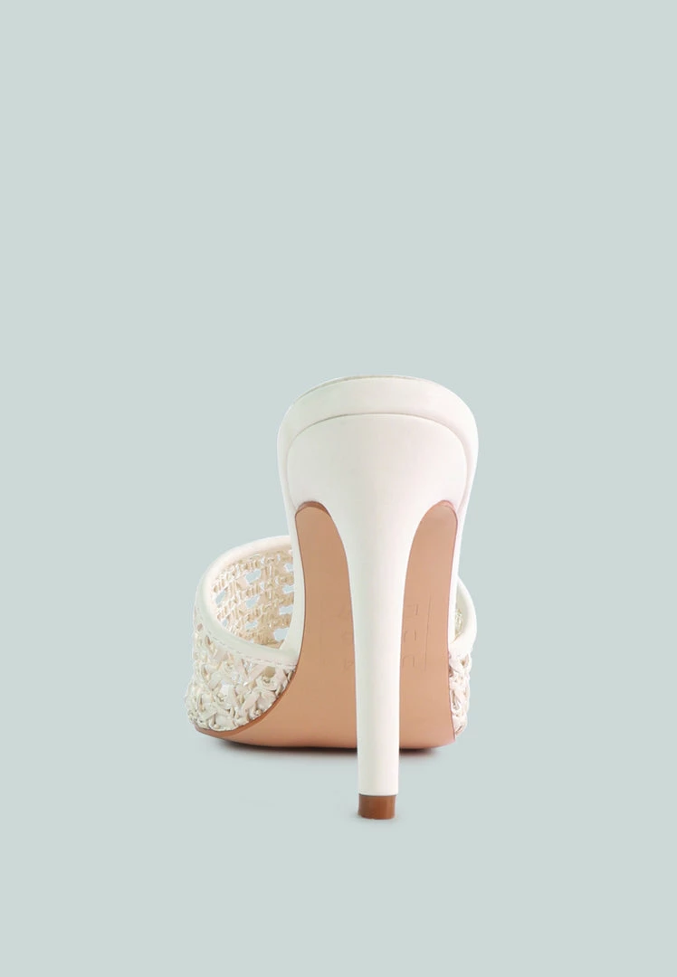 Soft Leatherette Raffia woven heeled slider sandals with lightly cushioned insole. Fits like dream and keeps feet relaxed.