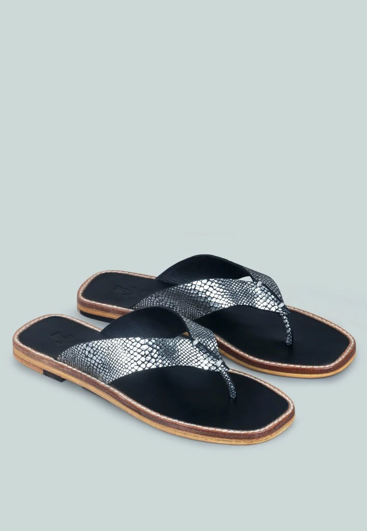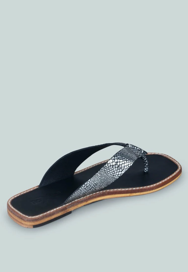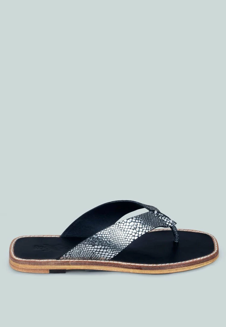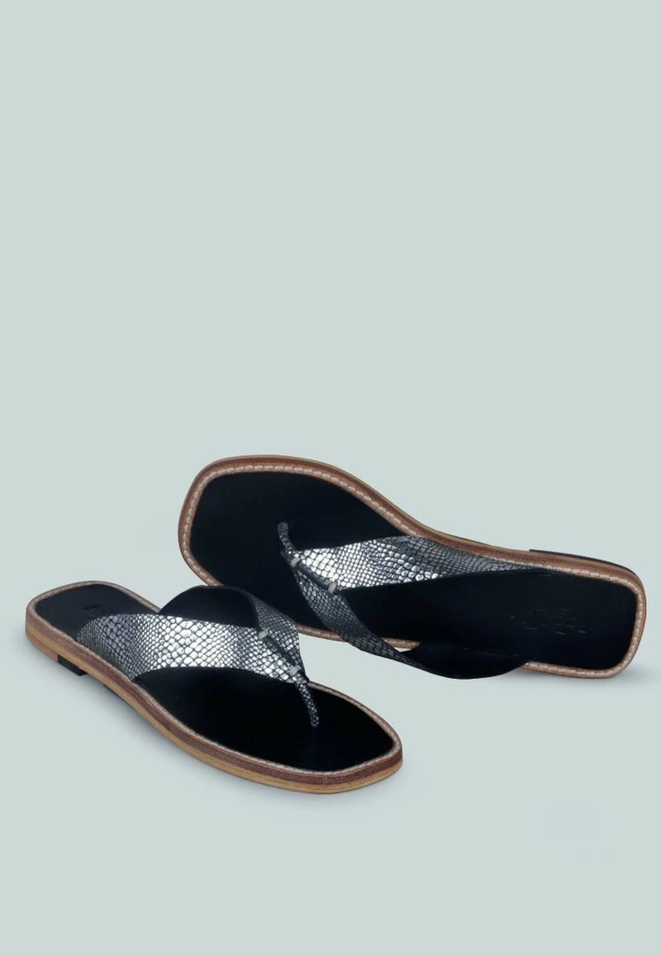 Handcrafted with natural leather – the pair of thong flats with croc textured strap and cut detail is a comfort casual footwear. Contrasting stitch line detail runs along with the leather frame of the flats. Flexible, breathable, and durable – must buy summer style.